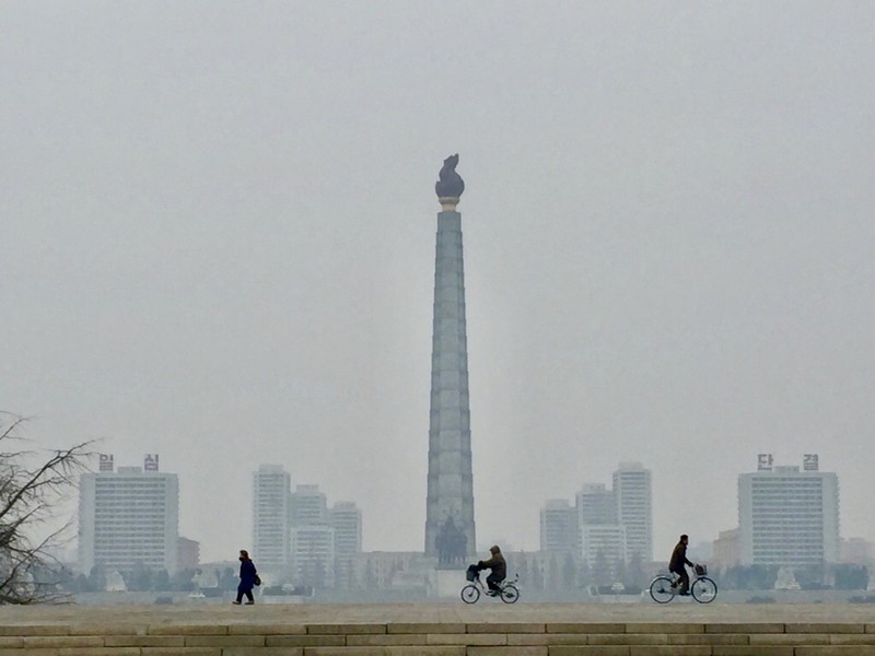 Người dân đi xe đạp ở phía trước Tháp Juche. Xe đạp vẫn là phương tiện giao thông phổ biến nhất ở Triều Tiên, các thành phố lớn và khu vực nông thôn. |