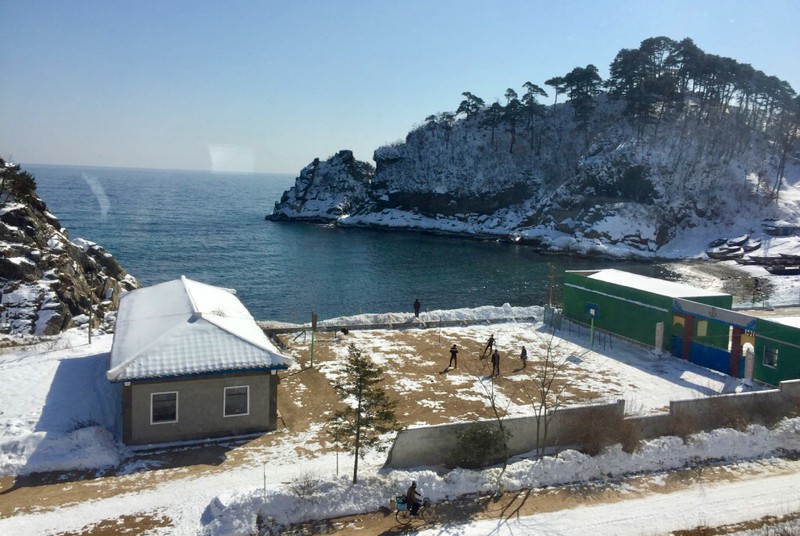Một sân bóng rổ gần ngôi làng của ngư dân ở Bắc Hàm Kinh với góc nhìn ra Vịnh Đông Triều Tiên. |