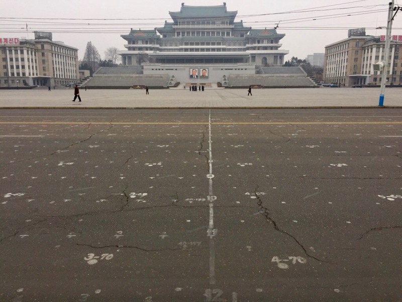 Quang cảnh của Quảng trường Kim Il-sung - những chấm nhỏ trên mặt đất đánh dấu vị trí của mỗi người trong các sự kiện kỷ niệm và tôn vinh quan trọng ở Triều Tiên. |