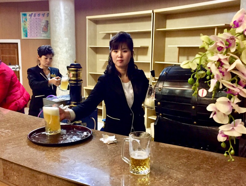 Một nữ nhân viên đang phục vụ bia tại một nhà máy bia ở trung tâm Bình Nhưỡng. |