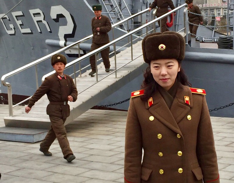 Hướng dẫn viên của chúng tôi tại Bảo tàng Chiến thắng và Binh lính Triều Tiên rời USS Pueblo - một tàu nghiên cứu của Mỹ bị Triều Tiên bắt giữ năm 1967 vì bị nghi ngờ là gián điệp. Tham quan con tàu là một phần bắt buộc của chuyến đi |